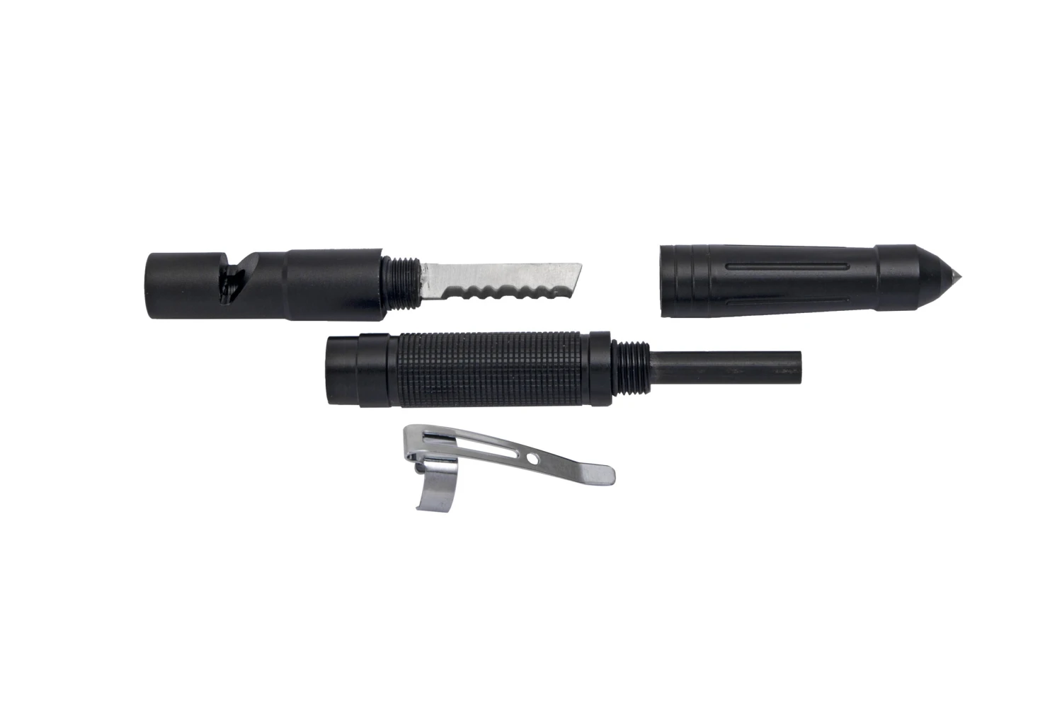 Dieses praktische 4 in 1 Tool gehört in jede Ausrüstung. Aus hochwertigem Aluminium gefertigt und kaum größer als ein Kugelschreiber vereint das Tool vier Funktionen um sich im Notfall zu helfen: einen Nothammer für Autoglas, eine laute Notfallpfeife, einen Zündstahl sowie eine sehr scharfe Säge. Die Gewinde des Tools haben ein sehr geringes Spaltmaß sowie eine Dichtung und sorgen dafür, dass Zündstahl und Säge vor Feuchtigkeit geschützt sind.