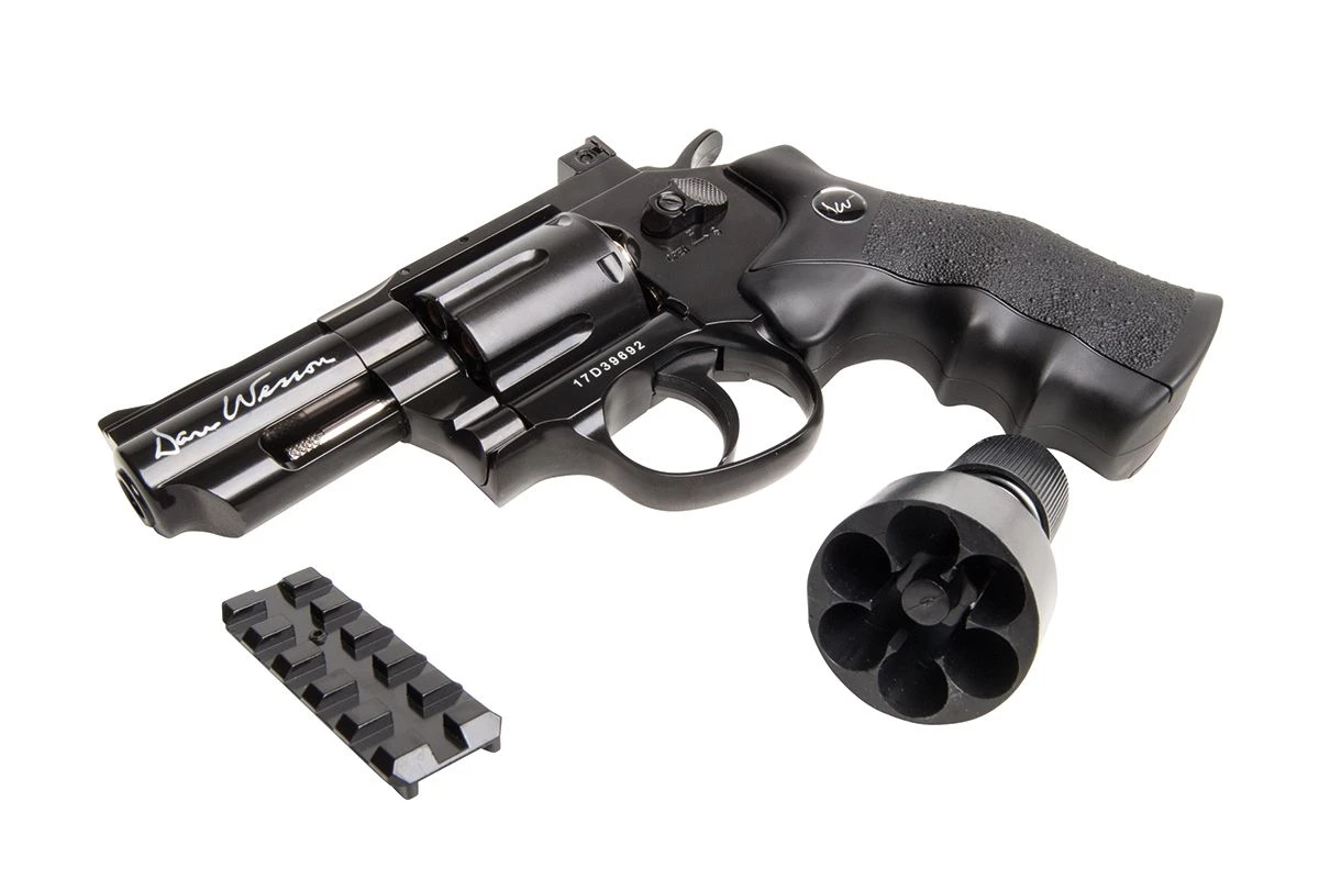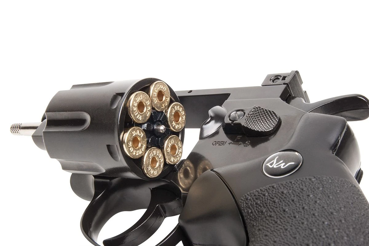 Der detailgetreue Nachbau aus dem Hause ASG mit einer Energie von ca. 1,4 Joule wird mit Co2 betrieben. Der Revolver aus Vollmetall verfügt über einen Double Action Abzug, eine verstellbare Visierung und robuste Kunststoffgriffschalen. Im Lieferumfang enthalten sind eine Montageschiene, ein Speedloader und 6 Hülsen.