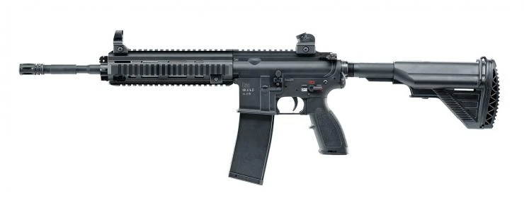 Das Erfolgsgewehr von HK ist der neueste Zugang bei den T4E-Modellen. Das originalgetreue und lizensierte Vollmetall-Modell hat 14 Schuss im Kaliber .43 im Magazin, wahlweise Kreide- oder Gummikugeln oder auch Pfefferkugeln zur Abwehr. Die Mündungsenergie aus einer CO₂-Kapsel beträgt 5 Joule, der integrierte Blowback-Effekt vermittelt ein realistisches Schießgefühl. Die Schaftlänge ist einstellbar, die offene Visierung erlaubt präzises Zielen.
