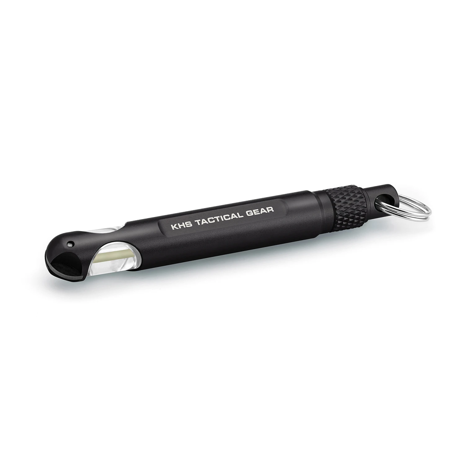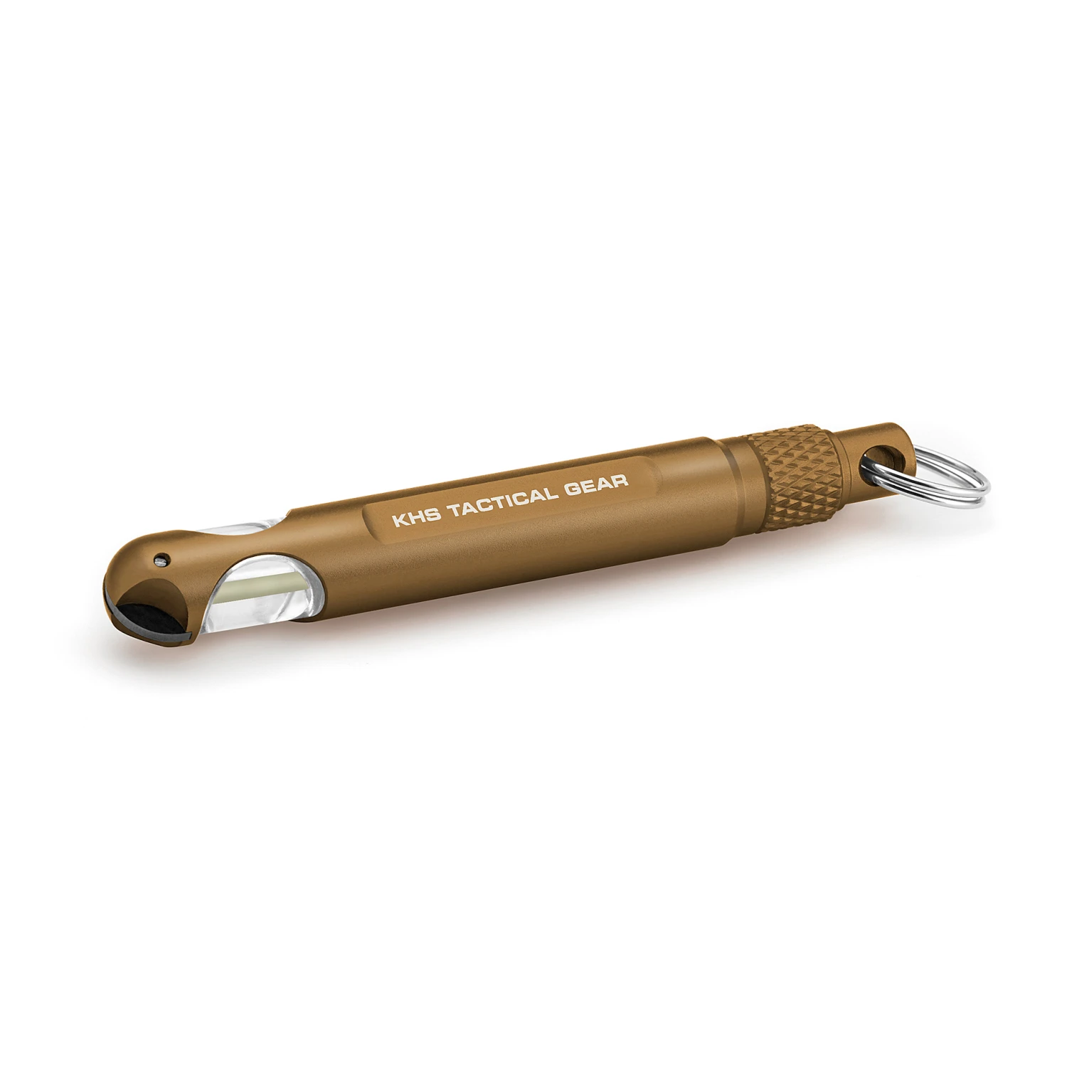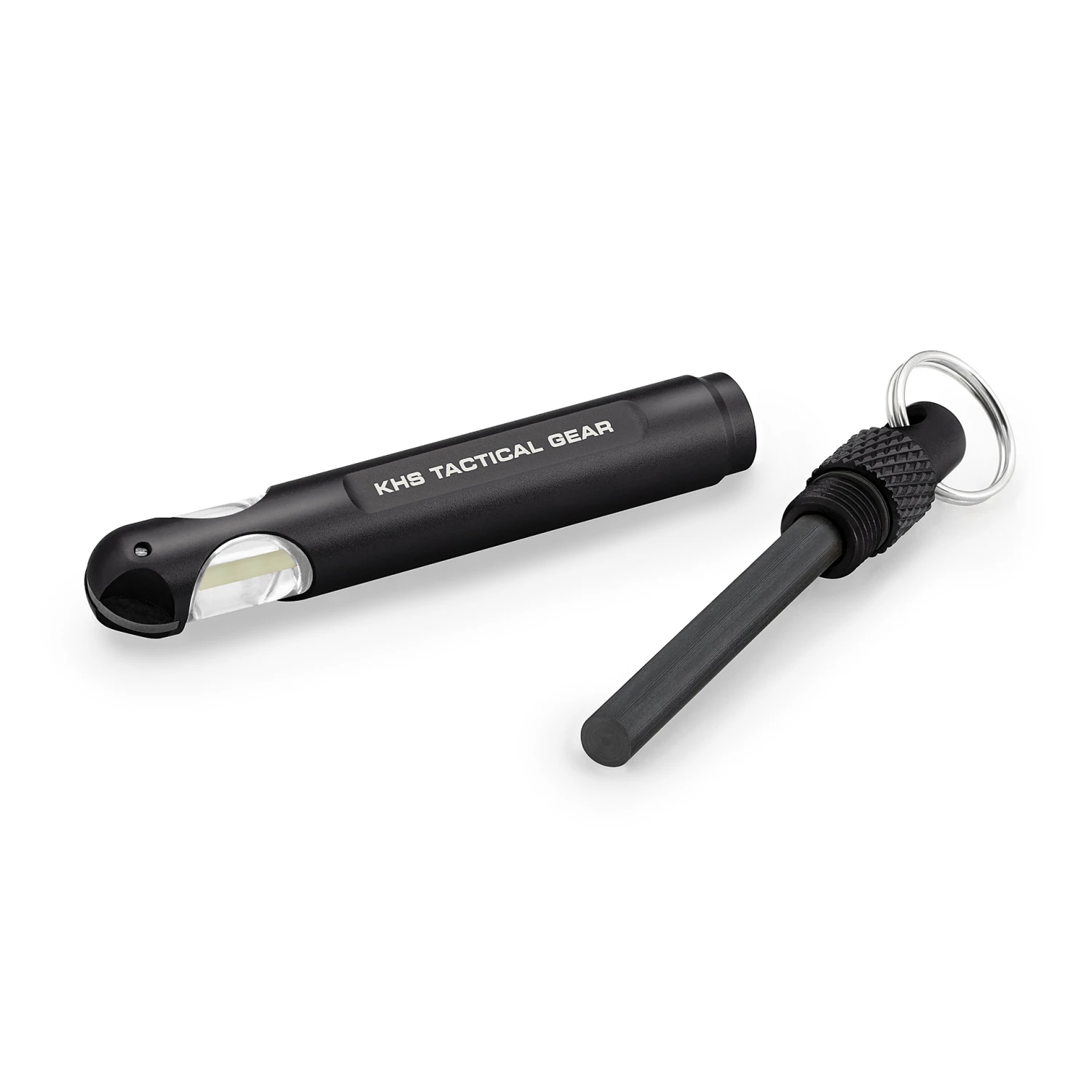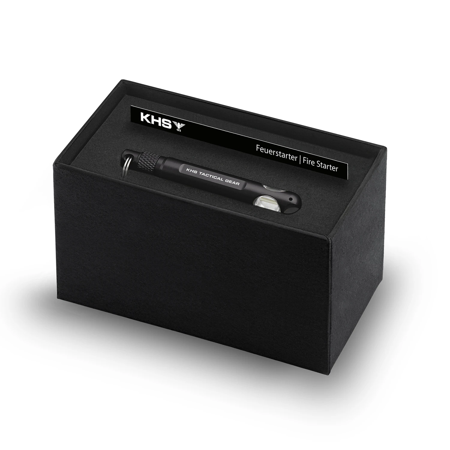 Der KHS Feuerstarter ist ein sehr nützlicher Ausrüstungsgegenstand mit eingebauter H3-Tritium-Gaslichtquelle zum Entzünden eines Feuers. Mittels der integrierten Keramikklinge können durch Reibung Funken mit einer extrem hohen Temperatur von bis über 2000 °C erzeugt werden. -