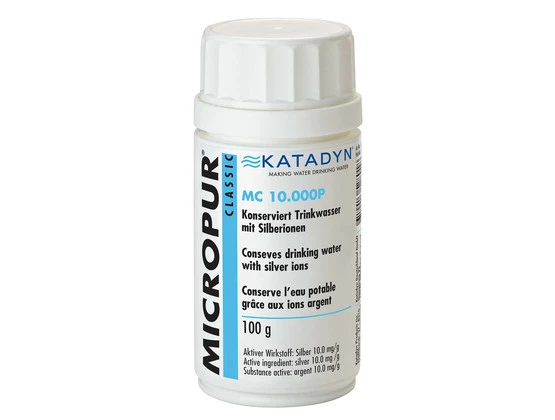 Katadyn Micropur Classic MC 10.000P (Pulver) – einfache Konservierung von Leitungswasser. Alle verwendeten Inhaltsstoffe sind für den Gebrauch im Trinkwasser zugelassen. Im Unterschied zu Chlor, das nur wenige Stunden in Wasser wirkt, machen Silberionen klares Trinkwasser bis zu 6 Monate haltbar.