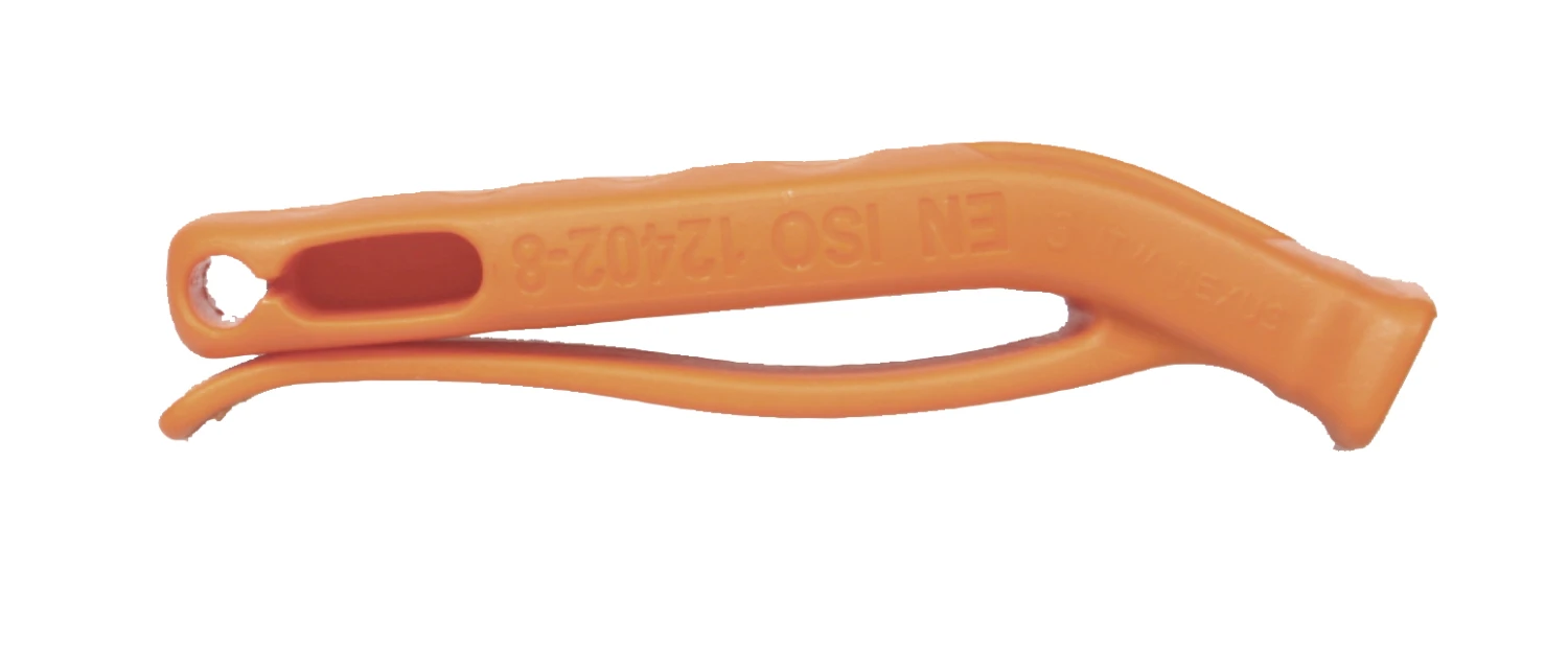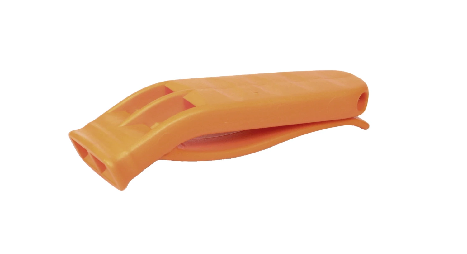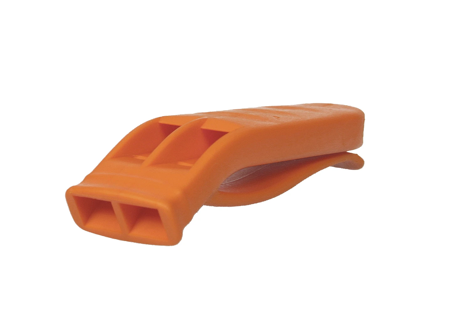 Schrille Doppeltonpfeife aus Kunststoff mit Klipp zum Befestigen am Rucksackträger, Gürtel oder Taschenrand. Auch eine Schnur kann eingezogen werden. Absolut unempfindlich gegen Wasser und Schmutz. Ideal als Signal für Notfälle und zur Kommunikation und auch für die Nutzung an Schwimmwesten zugelassen.