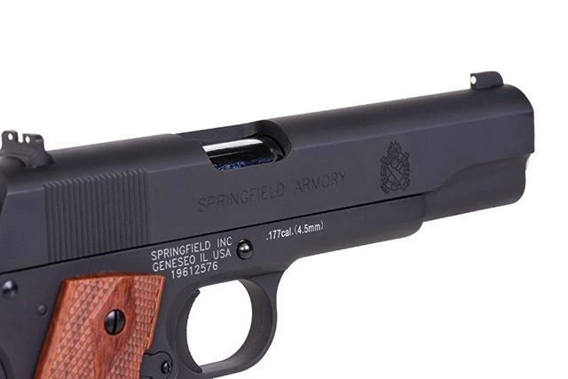 Die Springfield 1911 Mil-Spec im Kaliber 4,5 mm BB wird aus Vollmetall gefertigt und verfügt über geriffelte Kunststoffgriffschalen mit Springfield Armory Logo. Mit ihrem realistischen Gewicht, den authentischen Bedienelementen und dem staken Blow-Back-Effekt kommt diese Drucklustpistole sehr nach an ihr reales Vorbild heran und ist das perfekte Trainings-Werkzeug zum Plinking oder für Zielübungen.