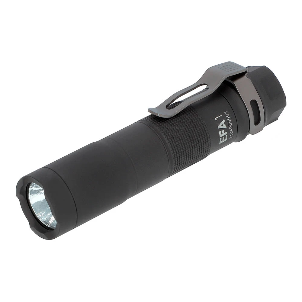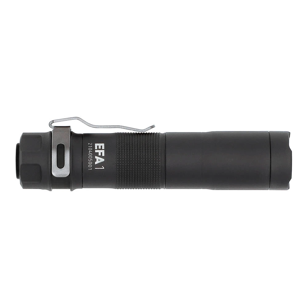 Die kompakte und handliche Allroundlampe empfiehlt sich als vielseitiger Begleiter für den Alltag. Bestückt mit einer AA-Batterie (1,5 V Mignon) bietet sie 4 Helligkeitsstufen (5/30/60/150 Lumen). Bei Verwendung eines Akkus Typ 14500 steigt die Maximalleistung auf beachtliche 350 Lumen. Ein/Aus und Momentlicht wird per Heckschalter geschaltet, während die Helligkeitsstufen sowie die Sondermodi (Stroboskop und Beacon) über den Seitenschalter aktiviert werden. Der Lichtstärkenspeicher stellt sicher, dass die EFA1 immer auf der Stufe startet, auf der sie zuletzt benutzt wurde. Die Restkapazitätswarnung gibt unter 25% Restspannung ein Signal. Der abnehmbare Edelstahlclip ermöglicht komfortables Tragen. Das solide Alugehäuse ist hartanodisiert und wasserdicht nach IPX8. Lieferung mit Nylonholster, Handschlaufe, Batterie und Ersatzdichtung.