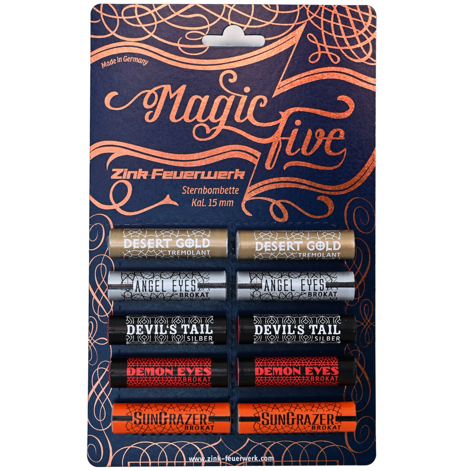 Pyrotechnische Munition Kal. 15mm bestehend aus: 2 x Sternenbombetten: Desert Gold, Angel Eyes, Sun Grazer, Devil’s Tail und Demon Eyes.